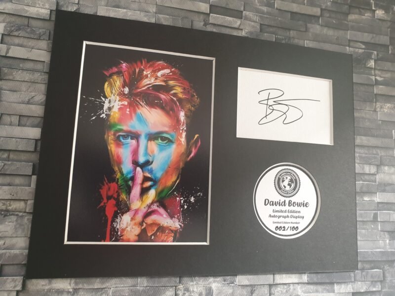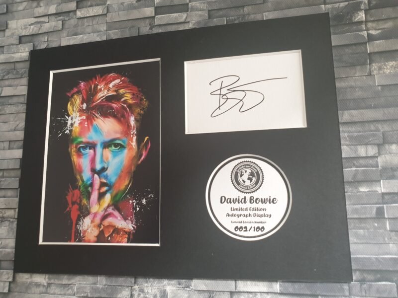 Our David Bowie signed print consists of an 6×4 inch matt finish photograph print of limited edition artwork that has been designed and created by myself, a digitally reproduced original autograph that has been printed onto pearlescent card using professional equipment and software, and a brief description with a limited edition number has also been printed onto pearlescent card. All of this is mounted onto 2mm bevel cut mount board and backed with 300gsm card.