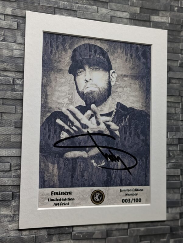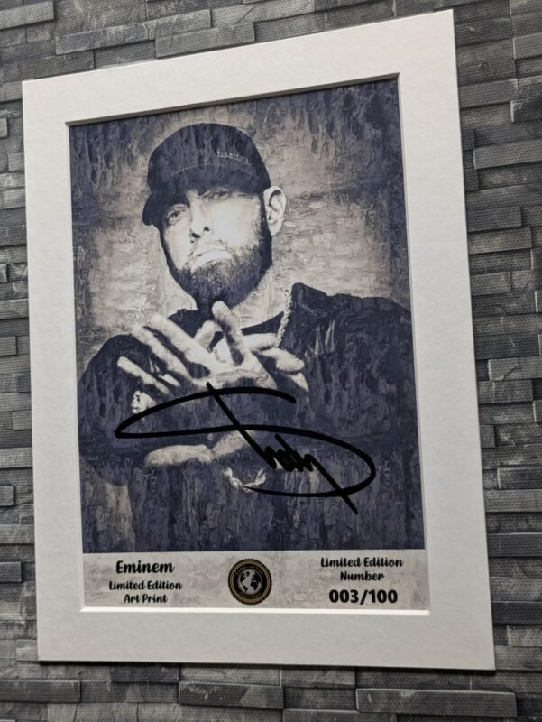Our Eminem signed print consists of an 8×6 inch matt finish photograph print of limited edition artwork that has been designed and created by myself, a digitally reproduced original autograph that has been added to the artwork using professional software, and a brief description with a limited edition number has also been added at the bottom of the print.